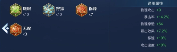 【铭文建议】鹰眼*10,打猎*10,祸源*7,无双*3