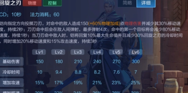 铠丢出一刀,对命中的对手带来伤害和一秒的80%减速,刀会在对手中间弹至多四次随后返回铠身上,对被弹中的对手带来伤害和两秒的30%减速,假如刀顺利返回铠的身上,铠恢复10%较大血量,降低一技能30%CD时间,与此同时增添三秒的移动速度和攻击速度。