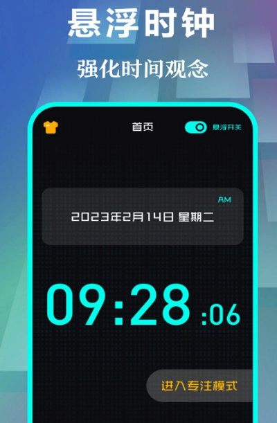 打开悬浮时钟后,整个界面给人的感觉十分清爽,以绿色作为主色调,设计简约又清晰,能让人一眼就看清楚当前的时间和日期。这款软件还配备了专注模式,一旦进入专注模式,秒表便会自动开启,就像在阅读时启用专注模式,阅读结束后按下暂停键,就能清楚地知道每天的专注时长。下载这款软件有助于增强时间观念,除此之外,它还有不少实用功能,例如精准的天气预报和日历等。