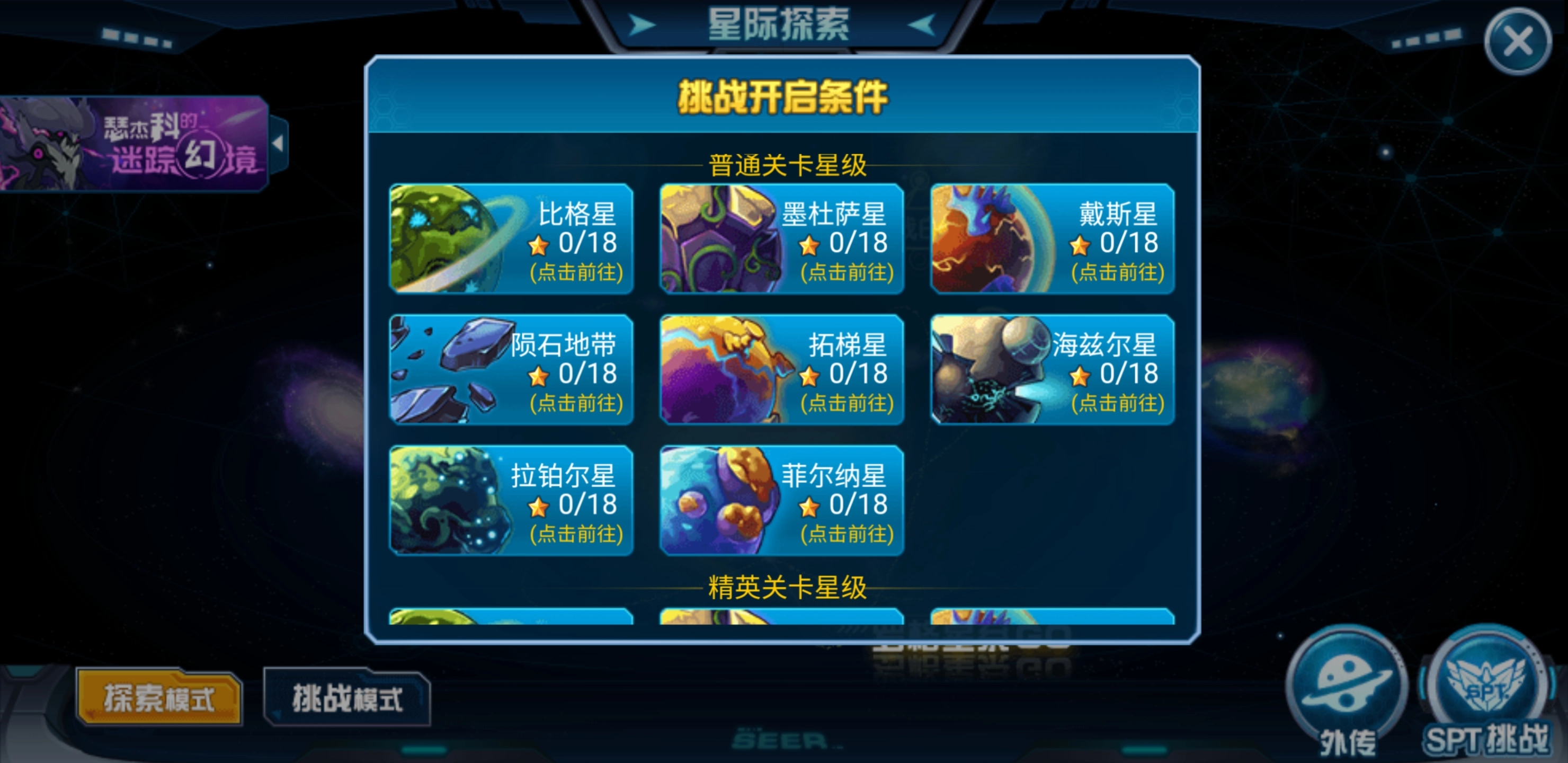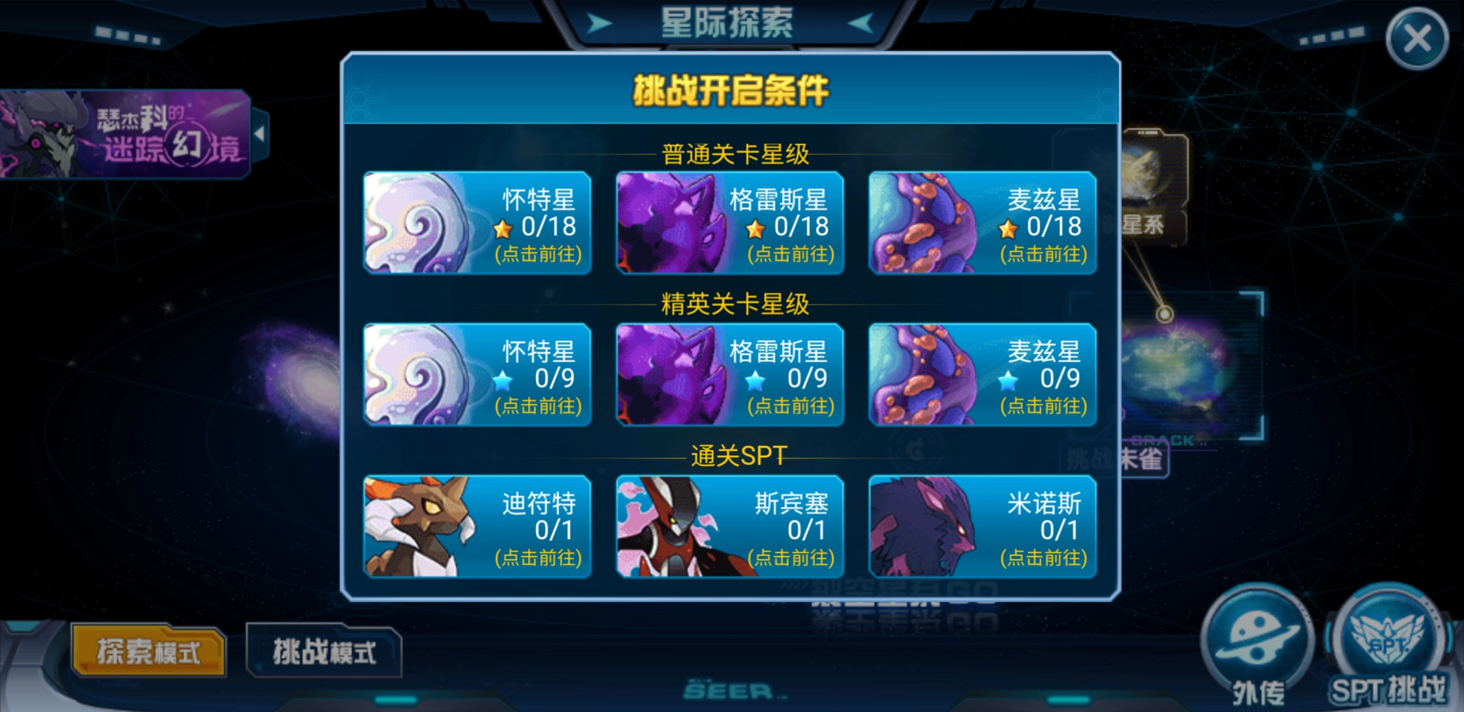 每个星球都设有BOSS关卡与封印关卡,玩家需积累足够的通关星数才能解锁下一个星球的关卡,不过只有完成BOSS关卡和封印关卡的挑战,方可真正开启谱尼真身的挑战。