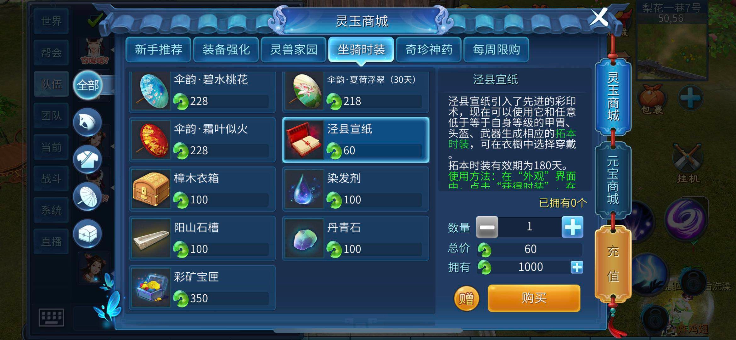制作拓本同样需要玩家在商城购买对应的道具,其中用于制作时装套装拓本的道具是泾县宣纸。玩家可以先点击进入商城页面,接着在商城内的灵玉商城中找到坐骑外观界面,随后向下滑动页面就能看到泾县宣纸这个道具了。泾县宣纸的价格并不高,仅需六十个灵玉,换算成人民币是六元,用六元就能获得一百八十天的时装使用时长,整体来看还是比较划算的。