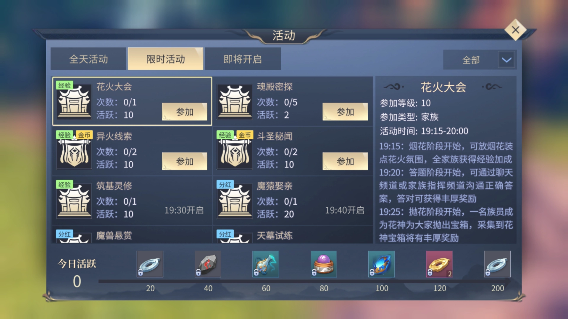限时探索:打开活动会看到三种活动:全天活动、限时活动和即将开启。打开限时活动会有一个异火线索,每天有2次探索的机会,每一次探索需要10点的活跃值。除了异火以外还可以获得金币和经验。