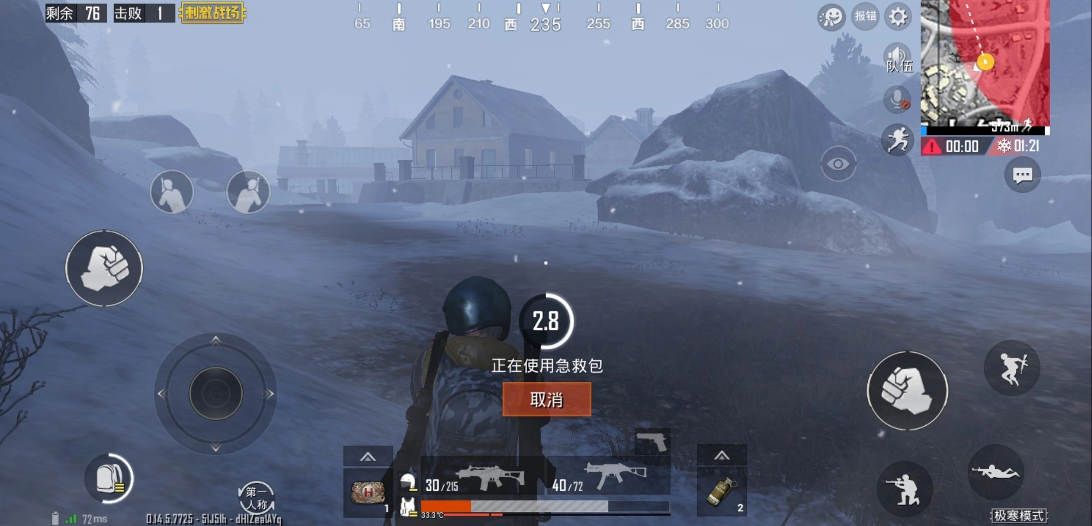 6、玩家进入游戏决赛圈后,此时的毒圈伤害极高,稍作停留血量便会快速下降。这种情况下,玩家就得使用急救包,或者效果更好的医疗箱来恢复状态。