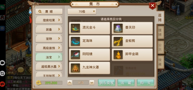 第一步,在主界面打开左侧边框的“交易”选项。接着在交易界面里进入“集市”,然后在集市最左侧的分类栏中选择“法宝”分类。此时会展示出多款不同的法宝,若想购买其中某一款,直接点击该法宝即可完成购买操作。
