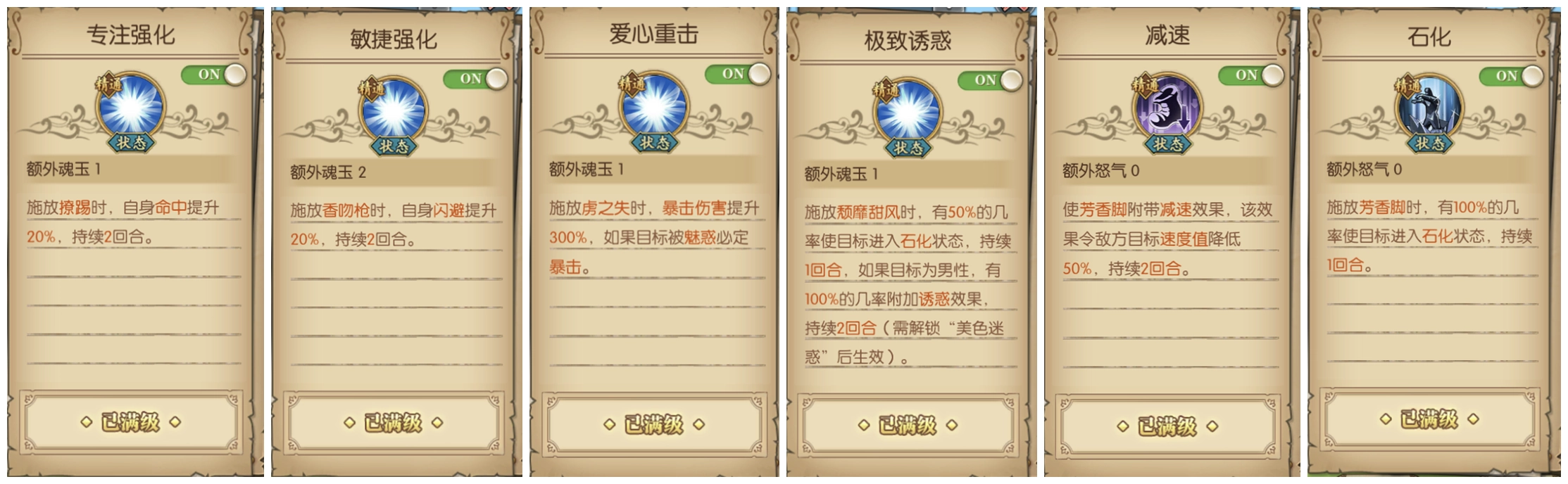女帝的助阵特效相当强力,能提升命中概率并减少暴击率,这可是天梯角色的关键属性。而且她的8星助阵特效也很厉害,在天赋本身就压制魂玉复原和肝火降低的基础上,每回合还能额外压制一名男性角色50%的肝火。就算没到8星,她的助阵特效依旧很受欢迎,能有效克制当前这个高闪避高爆发的版本。接下来我们从女帝的天赋开始逐一解析: