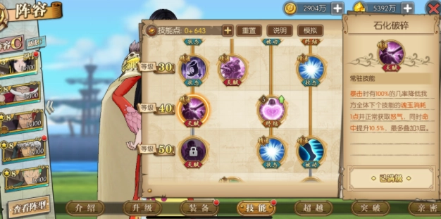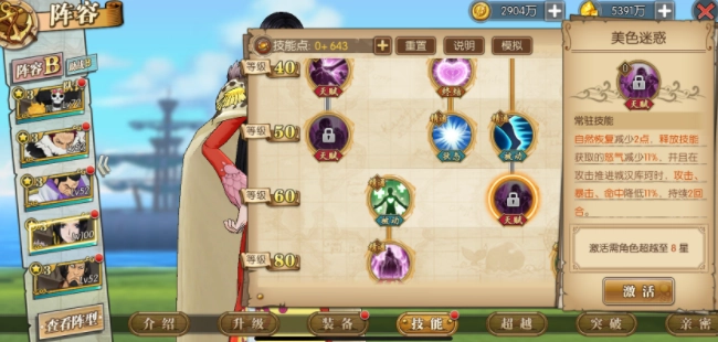 女帝的核心天赋效果显著:开场对敌方全体男性施加减益,使其魂玉复原量降低2点——10魂玉的角色直接变为8魂玉,而无视负面状态的角色则能免疫此效果。同时,敌方解放技能的效果也会被削弱30%,堪称相当棘手的天赋机制。不过该天赋仅能持续两个回合,若想延长生效时间,需依靠悲观甜风的终结技能来附加相关特效,但此技能仅针对横向一排敌人,实用性有限。即便如此,两个回合的持续时间已足够造成干扰,搭配藤虎使用时,“双控快乐队”的组合便由此成型。
