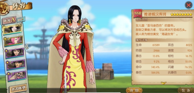 从角色面板来看,新女帝的精准定位是控场爆发、对位先手,六维面板更偏向辅助与爆发属性,是依赖高闪避和绑定路飞才能保障生存的角色。女帝的强势之处,源于她的高闪避率、为队伍提供的减魂玉辅助特效,以及自身强力的爆发伤害。不过,女帝要发挥这些强力特效,必须具备高速属性,且尽量拿到一速,否则她的技能效果会大打折扣。因此,其他上阵角色的速度属性需要进行调整。