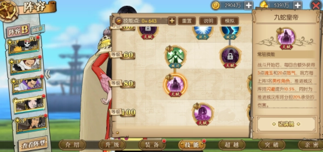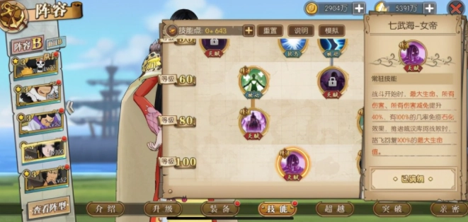 女帝那个关键团战辅助的自我保护天赋,能让她开场就获得3魂玉和20点怒气,毕竟她是8魂玉的角色。另外,女帝的自我保护能力还体现在,场上每出场1名男性角色,她的闪避就能提升10.5%。主要靠路飞、青雉和藤虎这几个角色撑着,直接给女帝加了31.5%的闪避。而且这些角色还能帮女帝分担伤害,总共分担了60%呢。面对单体输出的豹子时,女帝的生存情况还是得看她的闪避率够不够。