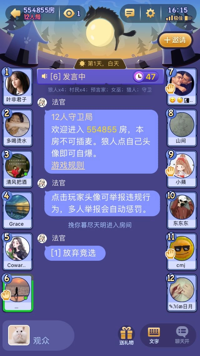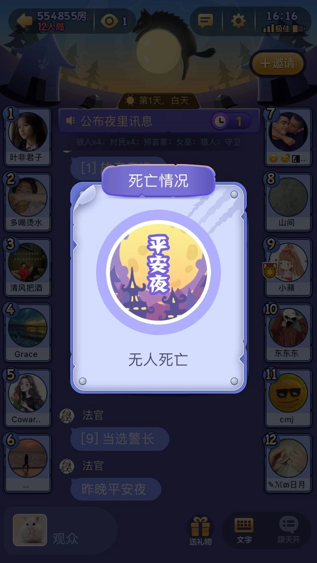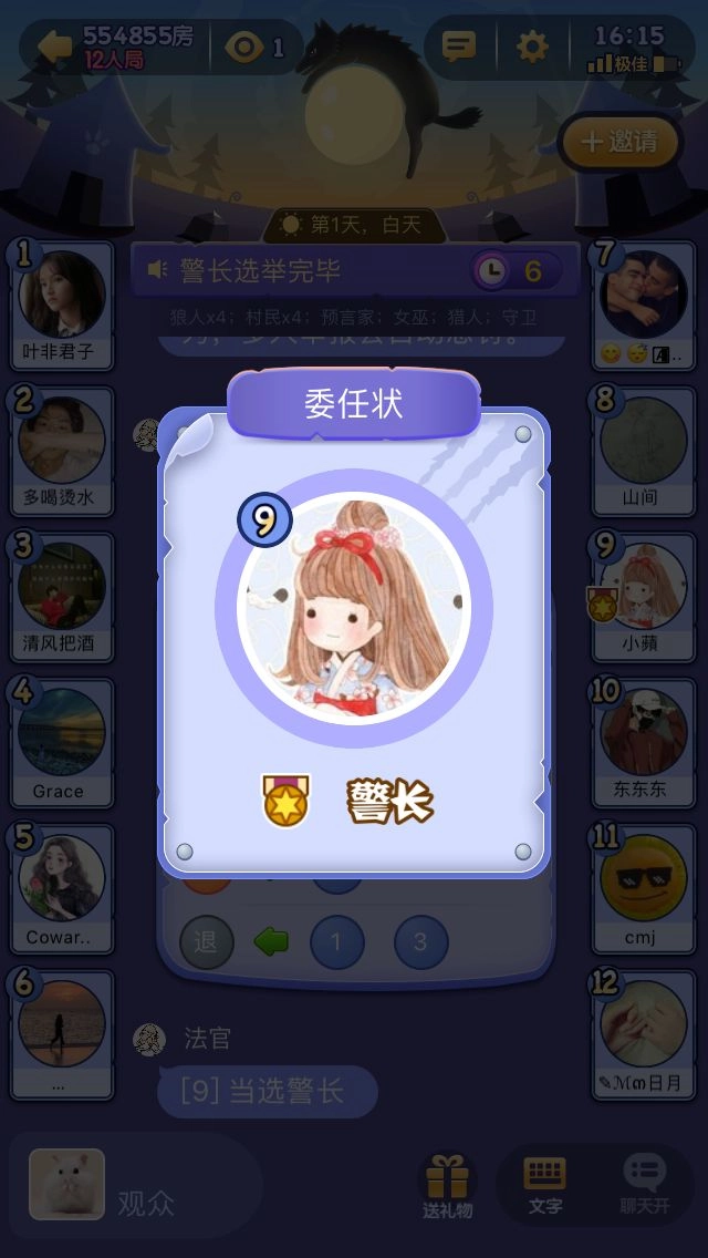 投票选出警长。只有未参与竞选的玩家具备投票资格,也可以选择弃票。要是得票最多的竞选者不止一人,就进行pk发言并再次投票。倘若依旧平票,那么本局游戏不产生警长。