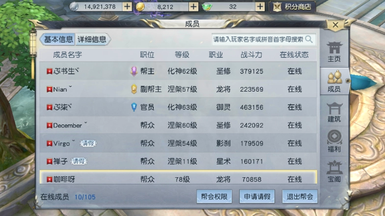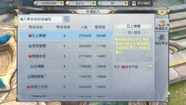 在这里能看到各个帮会的人数、等级以及繁荣度等信息,从这些方面大致就能判断出一个帮会的实力强弱。只要找到实力强劲的帮会,申请加入就可以了。