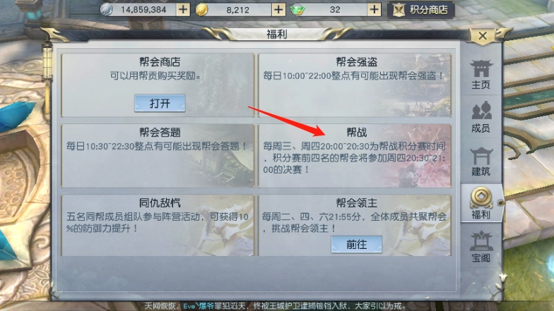 这里可以看到帮战是每周进行一次的,周三周四八点到八点半是积分赛,积分达到前4名才有机会参加决赛。
