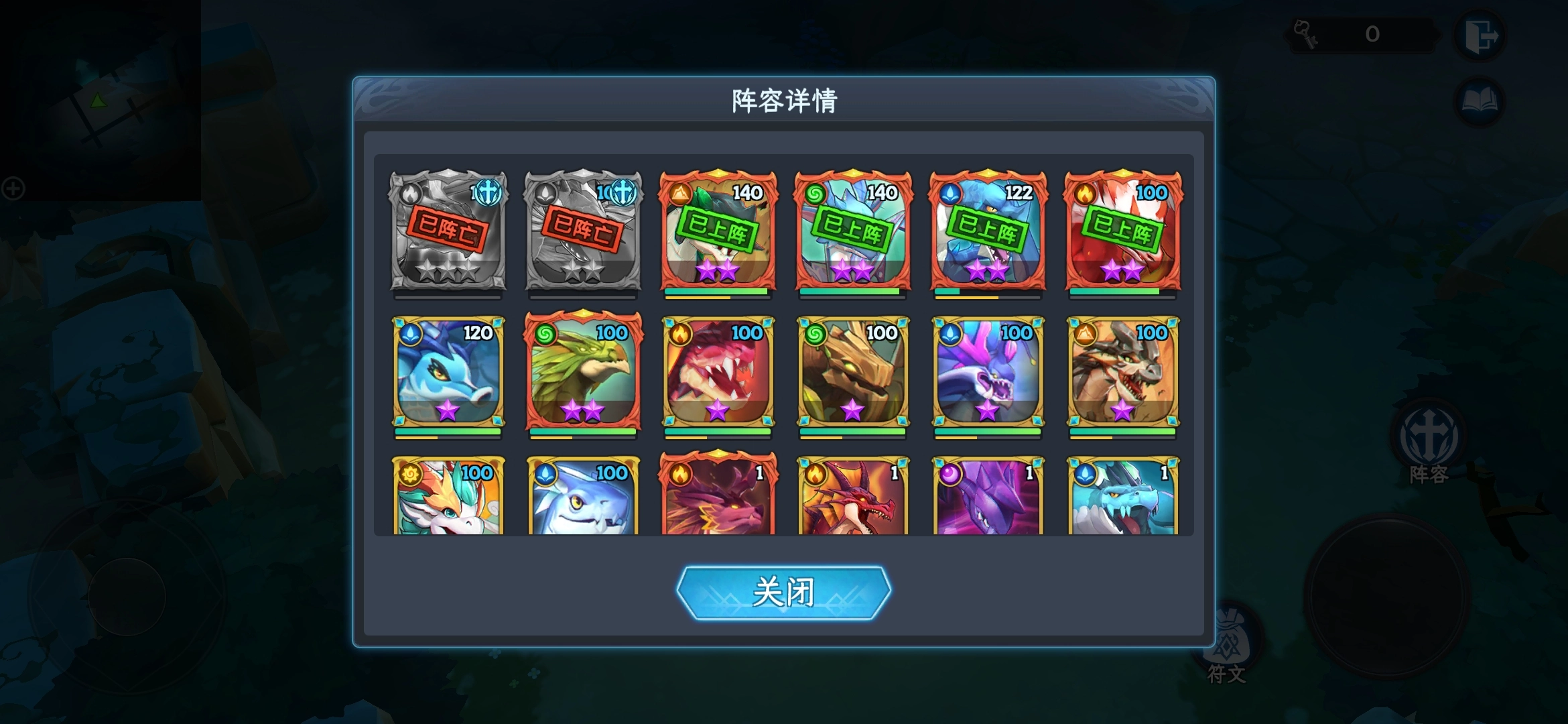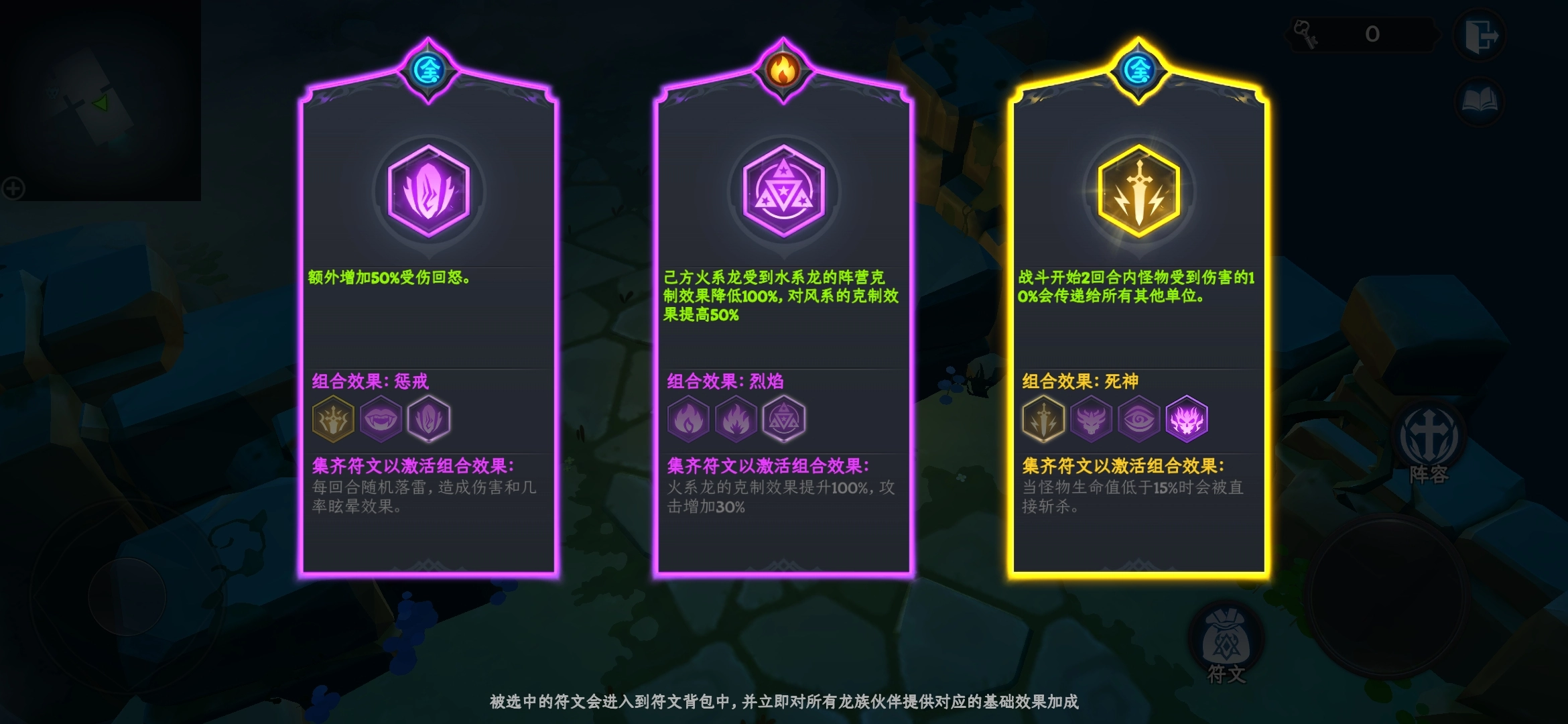 不过,值得一提的是,击败守护龙后会随机掉落符文,符文有蓝色、紫色和金色三种颜色,分为攻击和辅助两大类别,其中不同的紫色与金色符文能够产生不同的组合效果,激活这些组合效果后,阵容所获得的加成会更加丰厚。