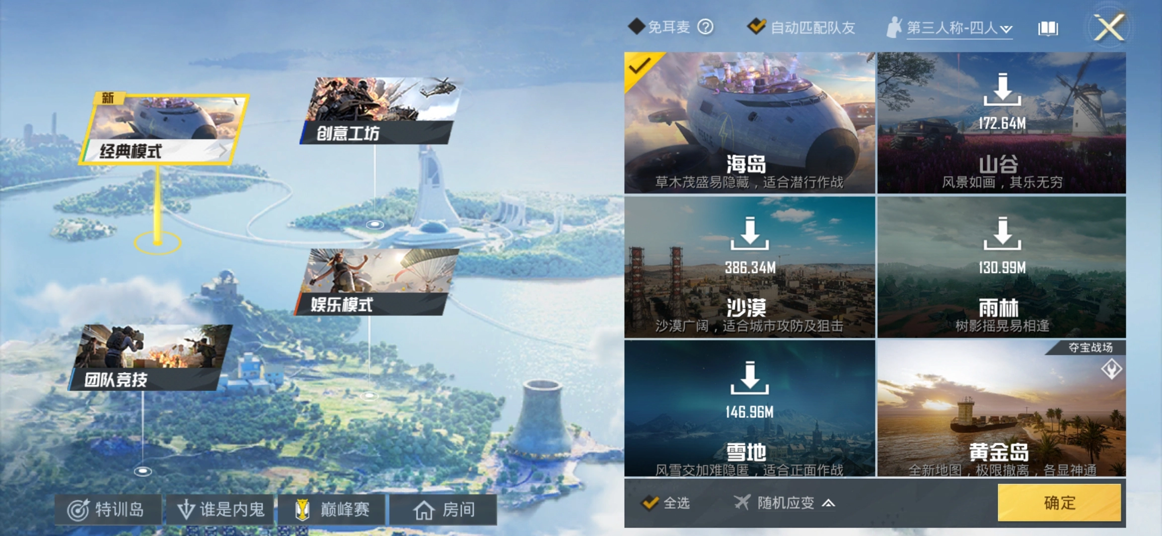 玩家若想进入黄金岛地图,需先打开和平精英首页,点击左上角的游戏模式选项,在六个地图中找到位于右下角的黄金岛地图,完成下载并打开后,即可进入黄金岛。