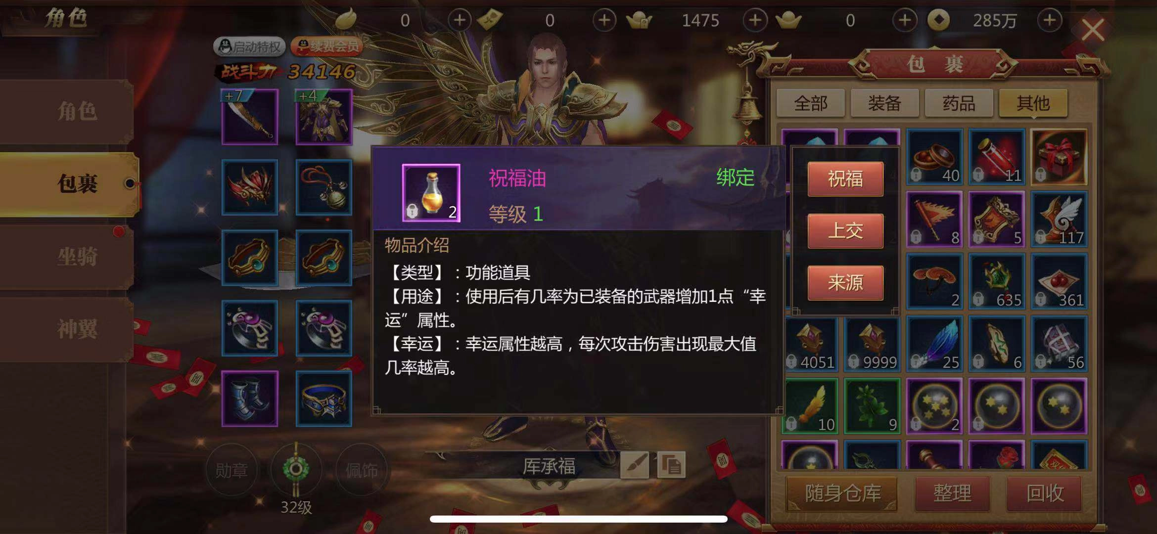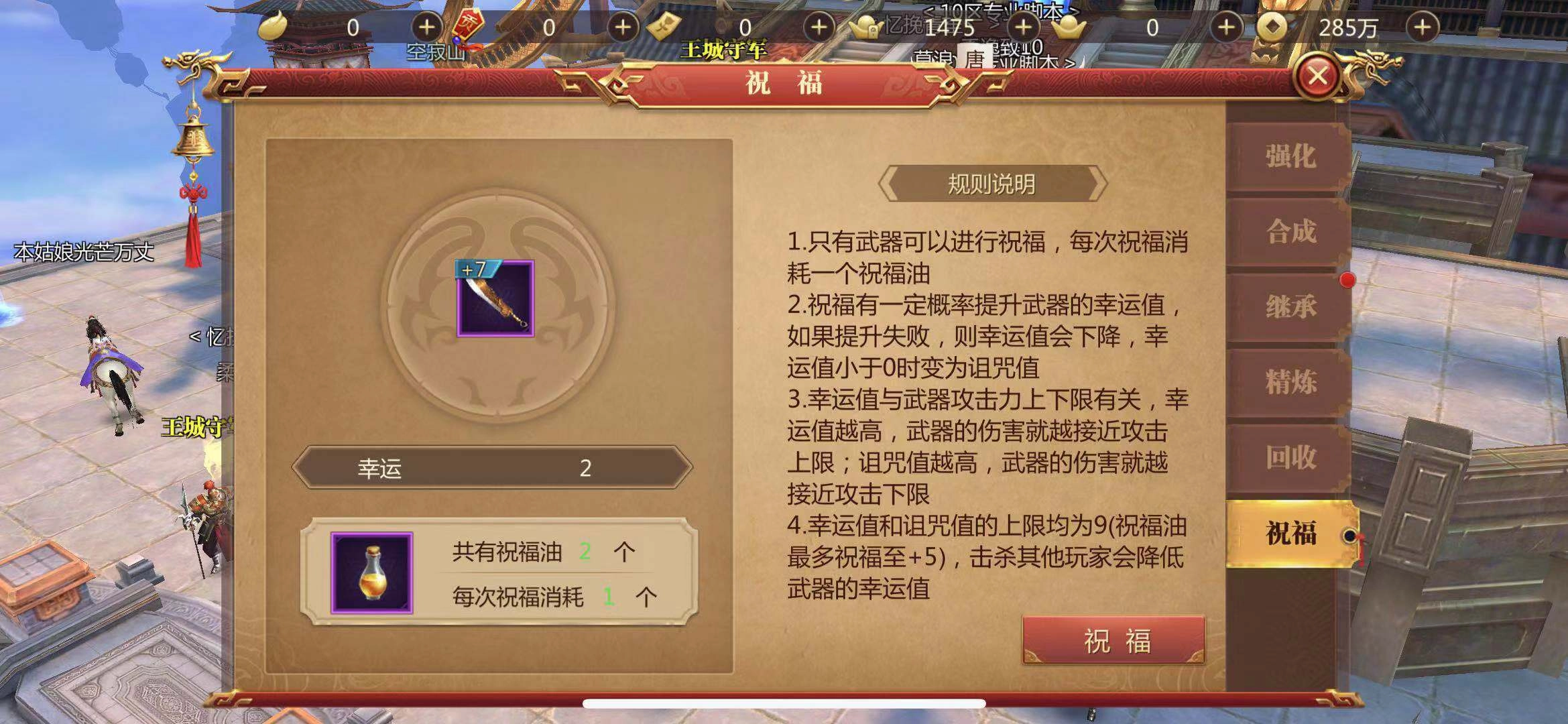 想要给武器提升幸运值,第一步就是要先获取到提升幸运值所需要的道具,祝福油就是能够提升幸运值的唯一道具,玩家想要给武器提升到幸运七属性就必须要大量的祝福油,祝福油的获取方式有很多,玩家可以从在线礼包中获取到祝福油,玩家每天登录游戏当达到一定的在线时长的时候系统就会赠送给玩家一些道具,其中就有祝福油道具,一般一次会赠送给玩家一到两瓶。