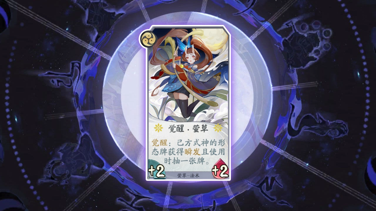 卡牌名称:觉醒·萤草卡牌等级:3级卡牌效果:我方所有式神的形态牌都能获得瞬发特性,并且在使用这些形态牌时,还能额外抽取一张牌卡牌作用:这款卡牌能够把萤草自身的优势延展到我方全体式神身上,这样一来,鬼火的消耗会大幅降低,同时过牌能力也能得到显著提升。不过在和慢速卡组对抗的时候,有时候得留意别让自己过牌速度太快,毕竟各位客人肯定也不想因为把牌库抽空了而输掉比赛吧建议式神搭配卡牌组合:吸取-转化×1、治愈之光×1、勇气之光×1、闪烁×1、安魂之光×1、虹彩×1、觉醒·萤草×1