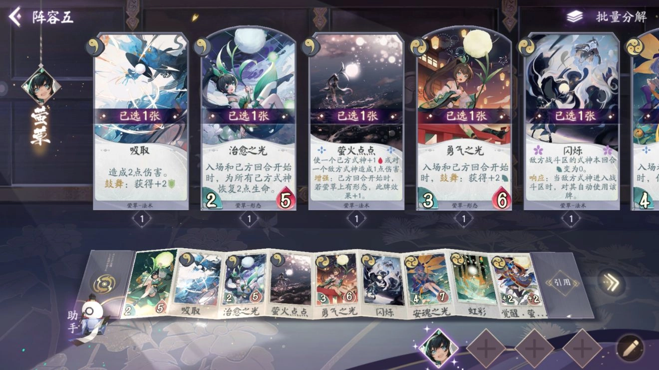 在卡牌选择上,建议采用均衡覆盖的策略——萤草的每一张卡牌都有着不可替代的作用:“吸取”可用于精准补刀,“萤火点点”能为式神提供生命续航。实战中可根据卡组特性灵活调整:若卡组偏向后期发力,不妨携带两张“安魂之光”或“虹彩”,以此强化后期的增益效果。进攻型式神搭配推荐:大天狗、兵俑、妖刀姬等 1. 得益于“觉醒·萤草”的能力(使队友形态牌获得瞬发,减少鬼火消耗),式神搭配上可优先选择依赖形态牌的角色,例如酒吞童子、大天狗、兵俑等——他们的后期节奏往往需要形态牌来打开局面。 2. 萤草的“勇气之光”能提供力量加成,当妖刀姬装备“妖刀万华”形态后,配合这一鼓舞效果,常能实现无伤击杀敌方式神,或是通过爆发伤害直接击溃对手。 3. 过牌能力在对局中至关重要,尤其对于妖刀姬这类手牌消耗较快的式神而言:过牌流畅的卡组能支撑你与对手持续消耗,而对手在往复消耗中易陷入手牌短缺,此时便是反击的最佳时机。实战要点 1. 萤草前期生存能力平平,且并非输出型式神,因此需尽量避免让她承受攻击,让她在后方专注辅助即可。 2. 萤草的形态牌自带瞬发效果,但每回合仅首次使用瞬发牌不消耗鬼火,切换形态时需留意当前鬼火数量,避免切换后无火可用的窘境。 3. 使用“虹彩”后会获得三张形态牌,而手牌上限为12张,务必注意手牌数量,防止出现爆牌的情况。总结 总而言之,萤草是一位泛用性极强的辅助式神,各项能力较为均衡,非常适合新手使用。若你的卡组缺少过牌手段或增益效果,带上这位手持蒲公英的少女,多半不会出错。
