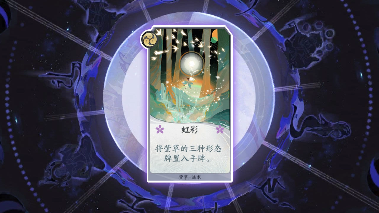 卡牌名称:虹彩 卡牌等级:3级 卡牌效果:把萤草的三种形态牌加入手牌 卡牌作用:作为三星法术牌,它能将治愈之光、勇气之光、安魂之光这三种形态卡牌加入手牌。需要注意的是,这些卡牌属于额外获取的范畴,并非从自身卡池中抽取而来。额外卡牌的存在意味着可获得更多增益能力,玩家能根据具体战局选择使用对应的能力,从而始终把控战斗节奏。