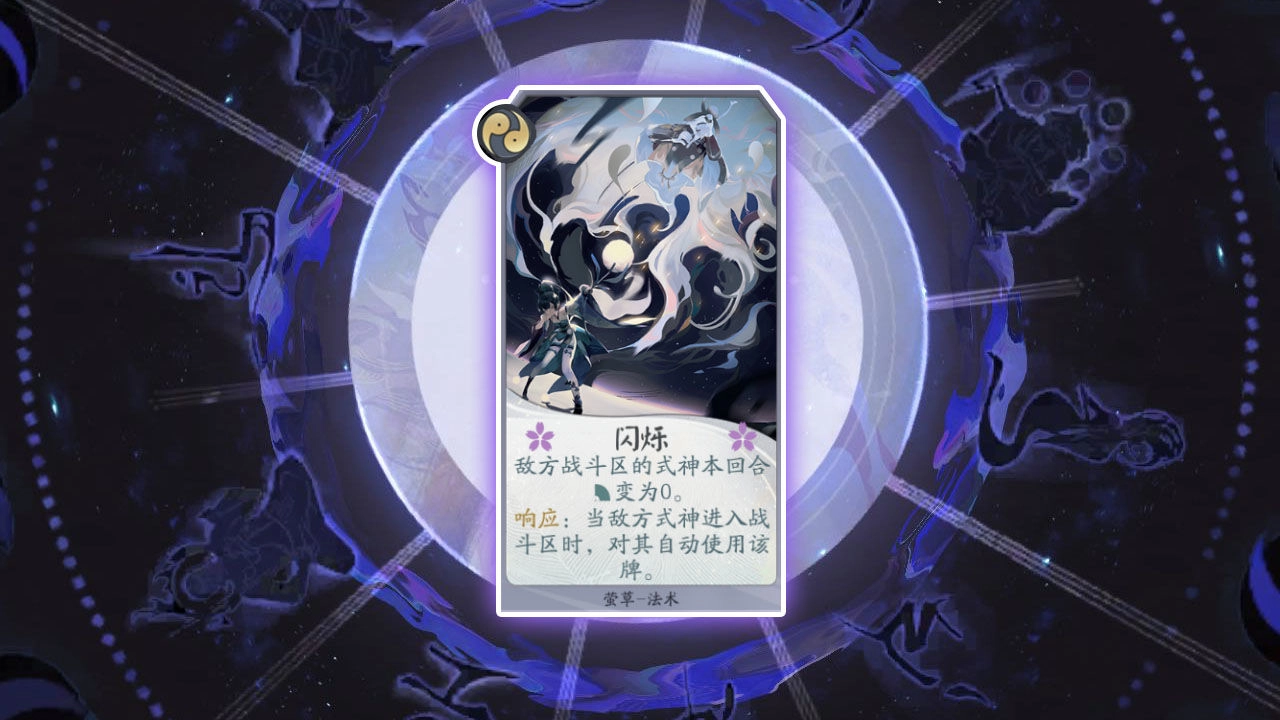 卡牌名称:闪烁卡牌等级:2级卡牌效果:使敌方战斗区的式神在本回合内力量变为0。响应机制:当敌方式神进入战斗区时,该卡牌会自动对其生效。卡牌作用:在敌方式神攻击数值过高的情况下,可主动打出此牌,协同己方式神完成击杀。若我方剩余鬼火,敌方发起进攻时也能触发这张牌,从而干扰对方的进攻节奏;在应对部分OTK卡组时,这张牌的作用甚至足以影响战局走向。