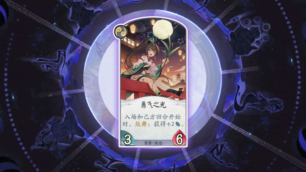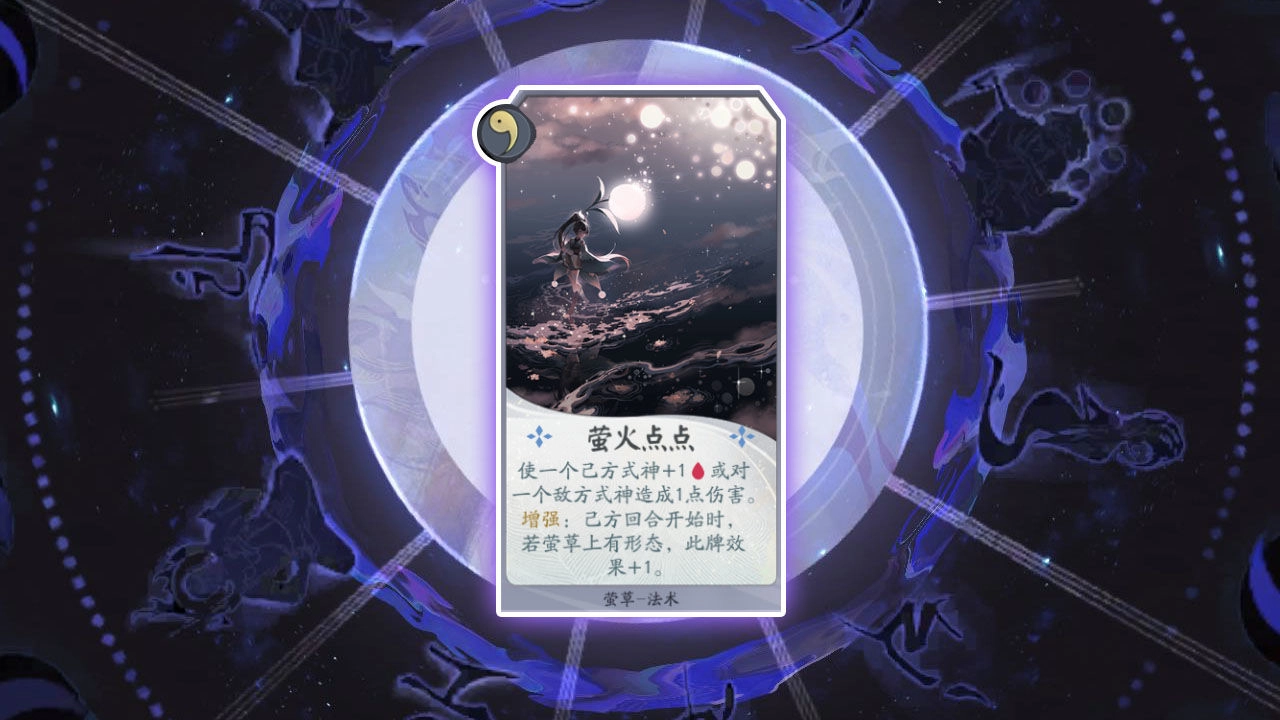卡牌名称:萤火点点卡牌等级:1级卡牌效果:为一个己方式神回复1点生命,或者对一个敌方式神造成1点伤害增强效果:在己方回合开始时,如果萤草处于形态牌状态下,这张卡牌的效果将提升1点卡牌作用:既能提高己方式神的生存几率,也可针对敌方脆弱的核心式神发起攻击。需要留意的是,只有当该卡牌处于手牌中时,才能获得“增强”效果的加成。若与1级形态牌“治愈之光”搭配使用,能够更快速地触发并叠加卡牌的增强效果