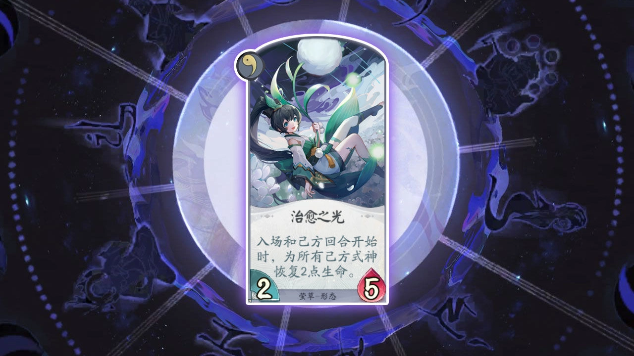 卡牌名称:治愈之光卡牌等级:1级卡牌效果:当这张卡牌入场以及己方回合开始时,会为所有己方式神恢复2点生命值卡牌作用:打出这张卡牌时,能触发萤草的基础能力额外抽一张牌;在对战前期,敌方对我方的攻击伤害普遍不高,这张牌能显著提升己方式神的生存几率。它尤其适配多进攻型式神的阵容——式神轮流发起进攻后,用这张牌进行群体生命恢复,无论怎么看都是稳赚的选择。