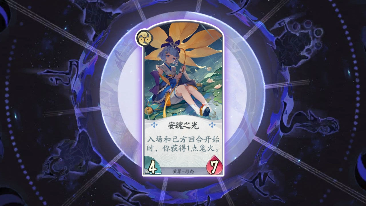 卡牌名称:安魂之光卡牌等级:3级卡牌效果:入场和己方回合开始时,你获得1点鬼火卡牌作用:萤草的核心形态卡牌,打出时和回合开始时获得一点鬼火,额外的鬼火意味着你在一回合内有着更多的出牌组合,想打出爆炸输出或是留一点鬼火给“响应”效果就看各位客人的选择了