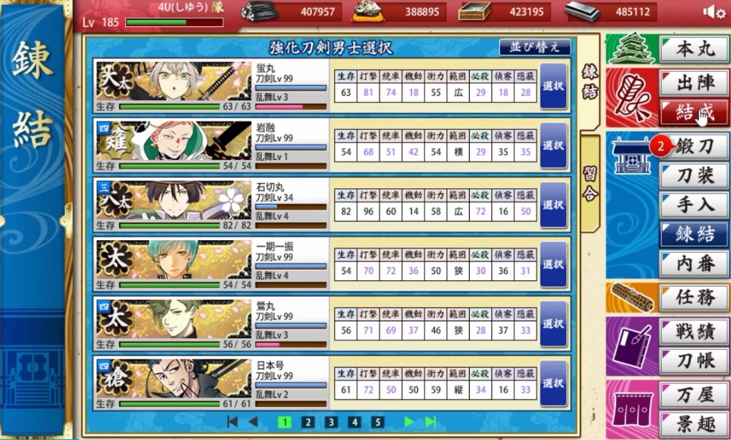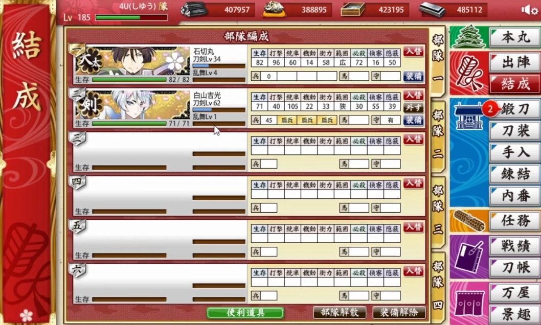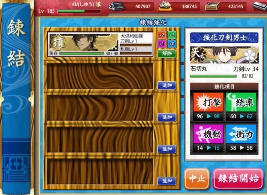 若玩家持有多把大太刀,可将它们编入同一队伍,先在前三张地图出击,在低级地图练至30级以上。待大太刀们完成第一轮特化后,就能进入四图练级了。另外,小编还建议玩家多进行錬结,把大太刀的属性喂满。