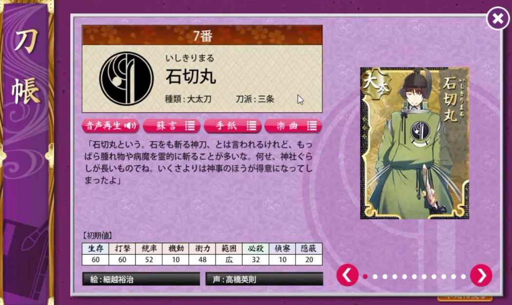 不过石切丸在大太刀组里的机动值是最低的,基础数值为10,特化后提升到13,即便极化喂满也仅有26。出手速度慢是他最明显的短板,不少玩家会把装备里速度最快的马匹分配给石切丸,希望能提高他的机动值,但效果通常不太好。即便游戏推出了石切丸的极化形态,他的机动数值依旧比不上其他大太刀。
