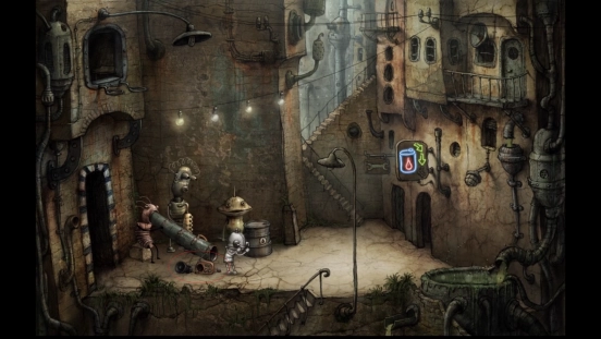 由于第三个乐手的乐器里钻进了一只红眼老鼠,致使乐器无法演奏,所以机器人得帮它找只猫来把老鼠从乐器里赶出去。不过抓猫的难度不小,得先爬上前面的楼梯,进入新场景后,能看到一位正在忙碌的老奶奶,她身旁还有个楼梯,接着再爬上这个楼梯。