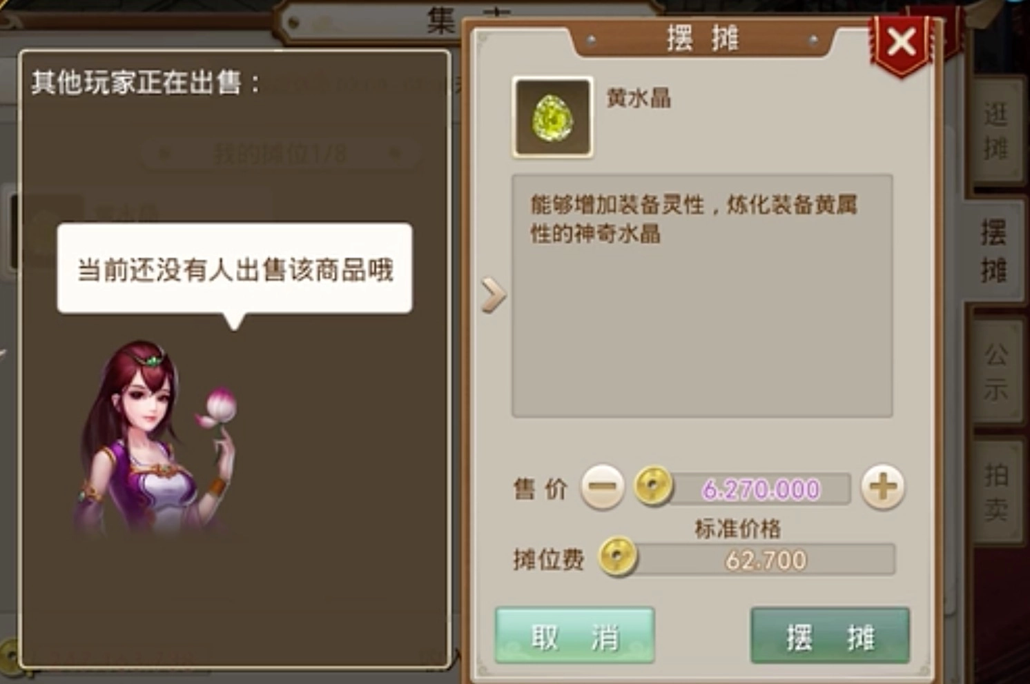 除了购买物品,我们也能把自己多余的道具摆摊售卖。具体操作很简单:在集市界面右侧能看到一个“摆摊”按钮,点击它,游戏就会弹出摆摊界面。