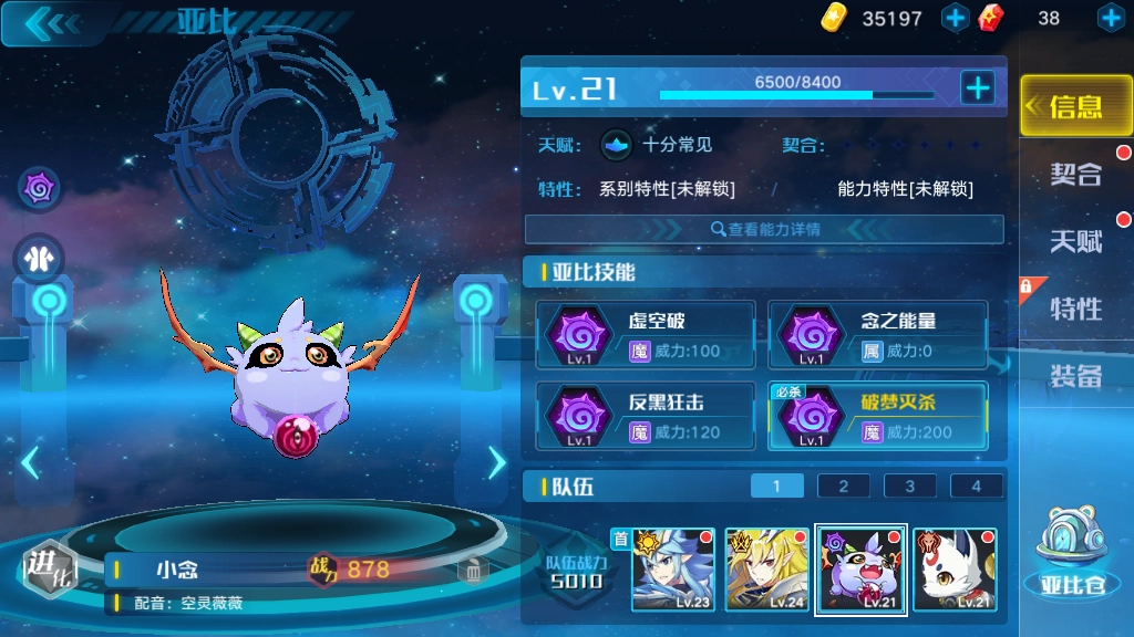 在游戏里,若想让小念这只亚比完成进化,玩家得去做“陪伴”这个支线任务。通过一段简短的剧情介绍后,就会开启战斗任务。念的进化任务包含两个关卡,分别是“心结”与“心魔”,把这两个关卡都完成,就能解锁念的进化形态了。