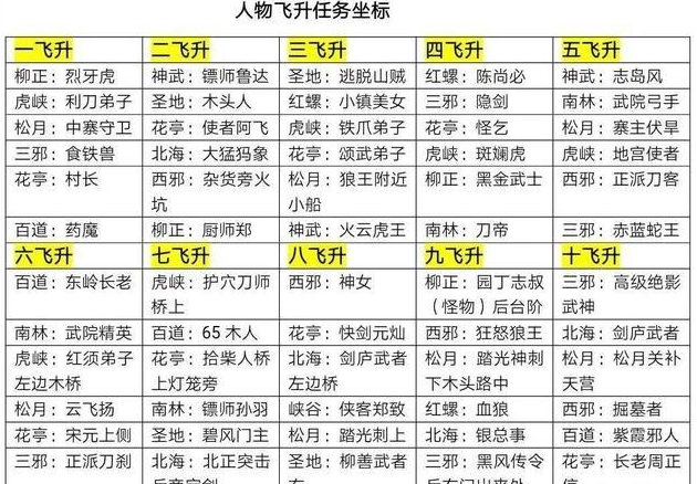 飞升任务的坐标说明如下:角色每次进行飞升,都需要完成六个飞升活动。具体的坐标信息如图所示。