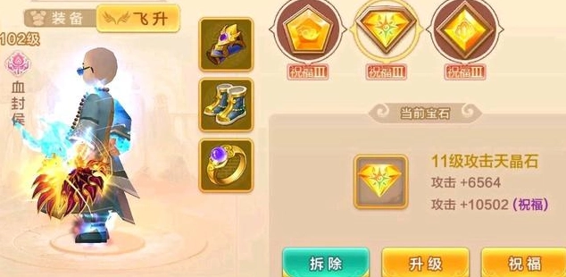 飞升晶石有攻击、防御、血气,几种属性。