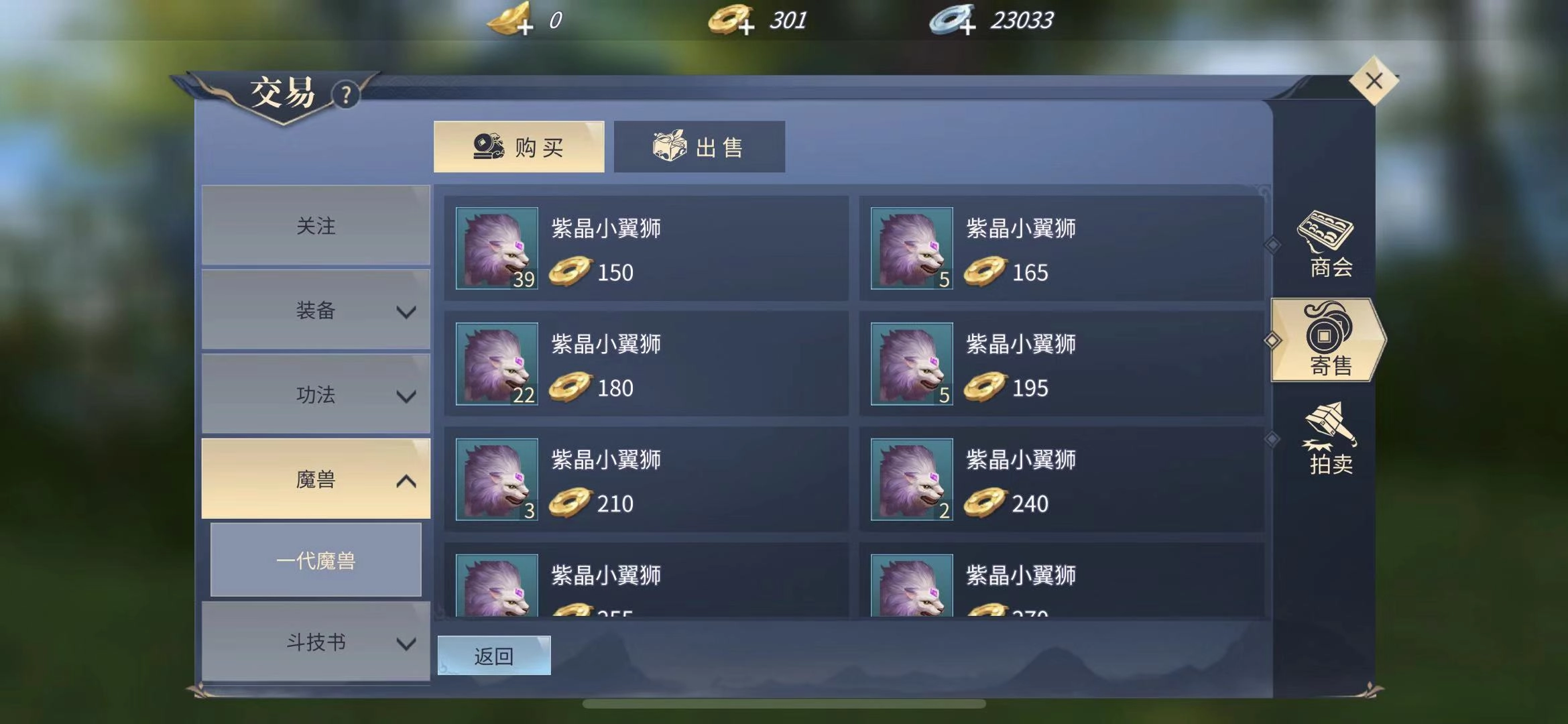 玩家要是在活动中没能获得紫晶小翼狮,也能通过交易界面进行购买。具体操作是:点击上方的交易按钮进入交易界面,接着点击右侧第二个寄售界面,再从左侧分类里找到魔兽一栏,就能在魔兽分类中看到紫晶小翼狮,点击进入后即可用金币直接购买。