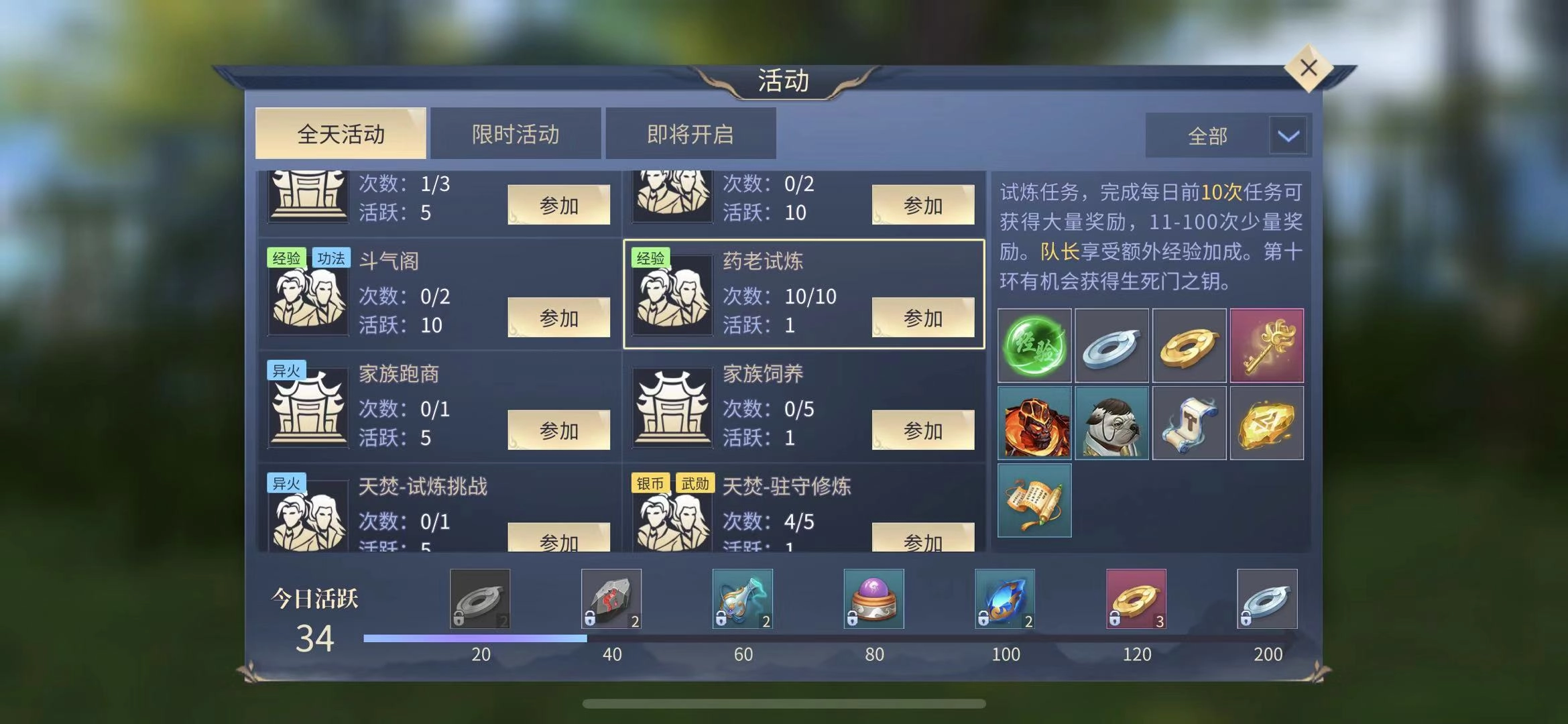 用户可点击左侧栏的队伍图标,筛选出参与药老试炼的队伍并加入,以此完成任务。完成任务后,从随机获得的物品里有机会得到紫晶小翼狮,且每个用户每天最多参与十次药老试炼活动。