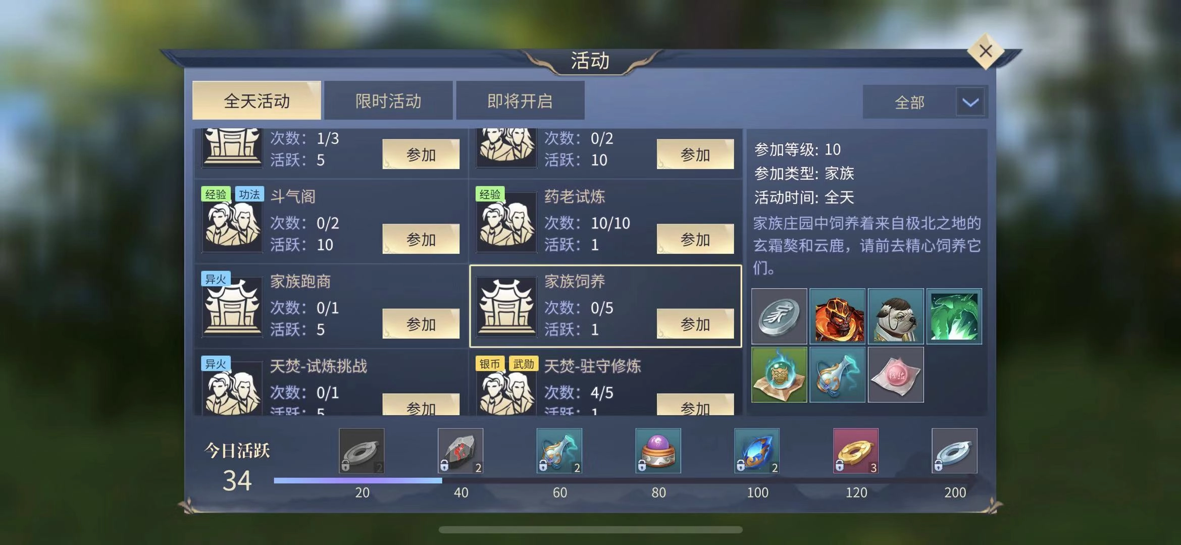 点击顶部的活动页面,接着选择全天活动选项,向下滑动页面就能找到家族饲养活动,之后点击旁边的参加按钮,系统会自动导航至家族饲养页面,随后依据活动指引完成动物饲养操作,每次完成饲养都能随机获取物品奖励,紫晶小翼狮便是其中的随机奖励之一。