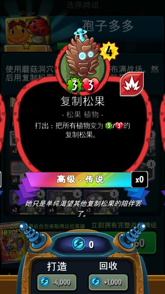 战斗进入中期阶段时,玩家能借助复制松果扭转局势。这种松果的特殊效果,会把战场上所有植物转化为松果形态——它们的攻击力与生命值均为3点,尽管并非顶尖战力,却胜在数量优势。前期召唤的那些低阶蘑菇,会直接蜕变为中等强度的单位,助力玩家更迅速地终结这场对局。