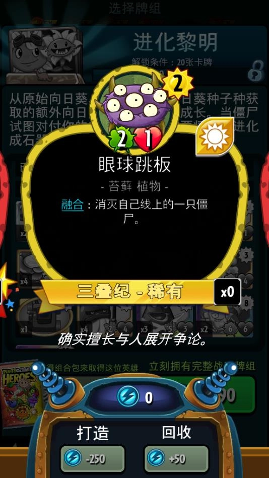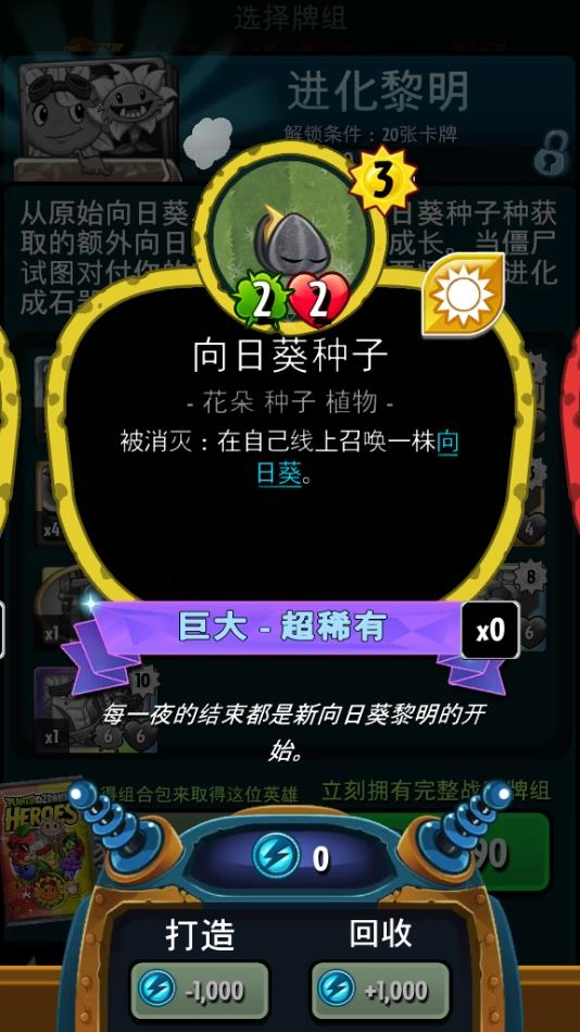 第二套推荐的是偏向发育的卡组“进化黎明”,这套卡组开局时缺乏战斗能力,玩家得靠向日葵、向日葵种子和光能之风来收集光能。等积累到一定光能量后,就能召唤高级植物投入战斗。尽管开局节奏较慢,但随着向日葵数量增多,后期战斗会变得轻松不少。