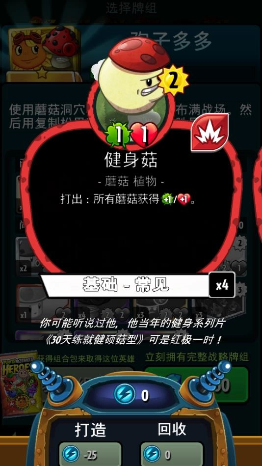 在对英雄的基础能力有了一定了解后,玩家搭配卡组时就能更有方向了。首先推荐的是孢子多多卡组,这套卡组的稀有度不算高,实用性却相当出色。战斗开局时,借助英雄技能和蘑菇洞穴,能召唤出不少蘑菇参与战斗。尽管蘑菇的攻击力不强,但前期僵尸的防御能力也比较弱,正好可以应对。