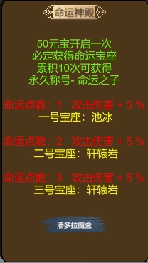命运神殿提供全伤害+5%的属性,来一起与全服玩家夺取命运宝座吧!