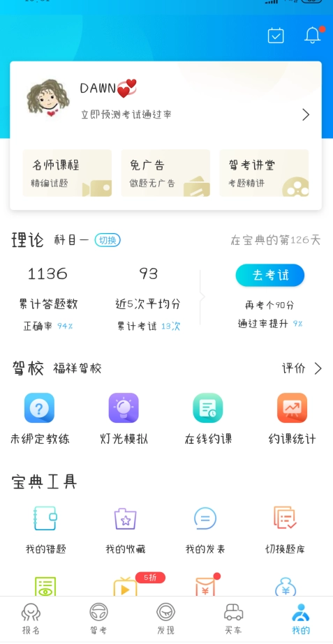 5. 点击“我的”进入个人中心页面。在这里,您可以购买包含各类考试项目优惠套餐的名师VIP课程,还能获取通过率预测;同时,也能查看已学考试项目的平均分、正确率等学习数据。此外,您可在此确认已报名的驾校,点击“在线约课”即可向该驾校的教练预约课程。