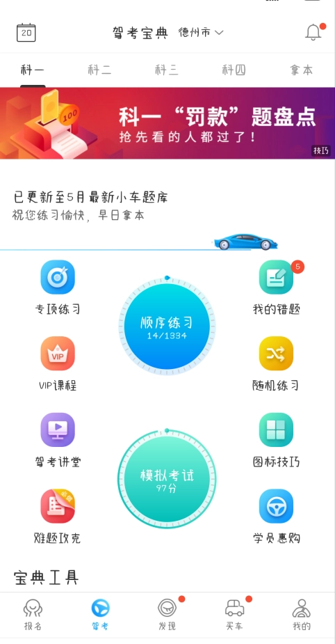 在宝典工具里,能查看自己的错题、收藏以及浏览记录等内容。点击“题库设置”就能切换或者更新题库。在我的圈子中,可加入地理位置相近的小圈子,在这个圈子里可以寻找车友,和大家一同探讨技巧方法之类的内容。
