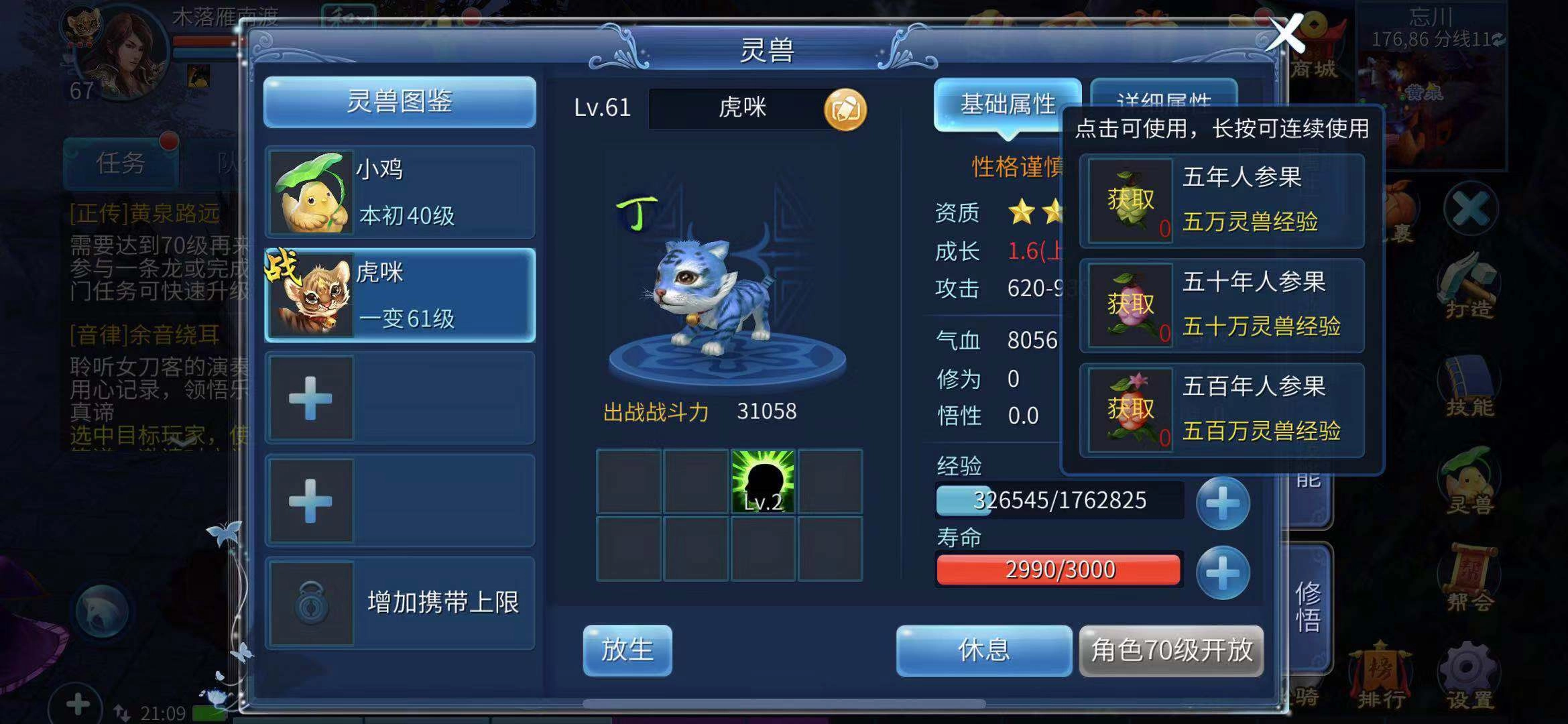 灵兽的战斗力与等级关联紧密,玩家获取新灵兽后,首要任务便是提升其等级。一种方式是带着灵兽前往适合自身的地图刷野怪升级,但耗时较长;另一种则是使用经验果,五年、五十年乃至五百年的经验果均可使用,年数越高提供的经验越多,这些经验果能在商城和易市中买到。