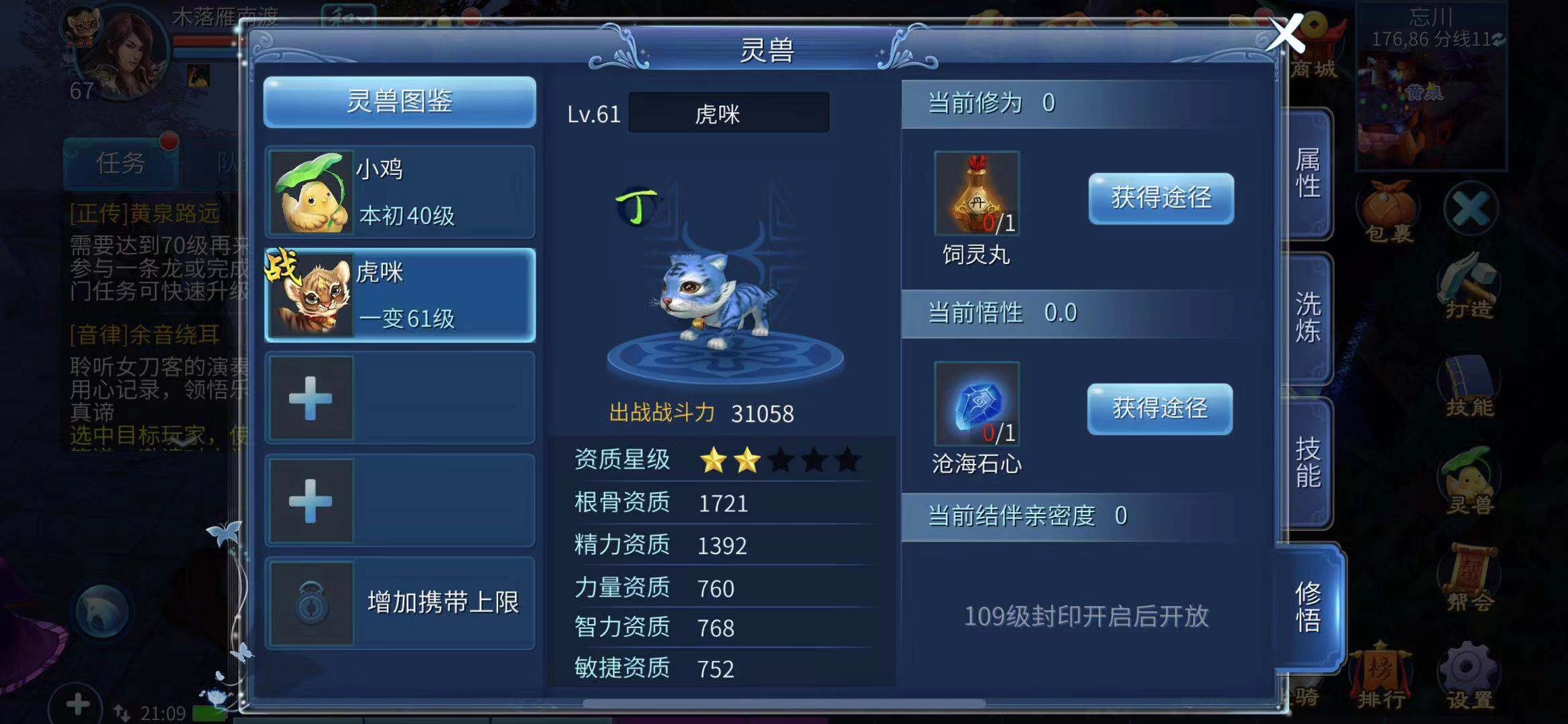 玩家也能在灵兽面板借助修悟功能直接为灵兽添加属性值,在该界面中可使用饲灵丸与沧海石心对灵兽开展直接培养,培养完成后会提高灵兽的修为和悟性,进而能够用于提升灵兽的各项资质,以此提升灵兽的资质星级,最终实现增强灵兽战力的目标。