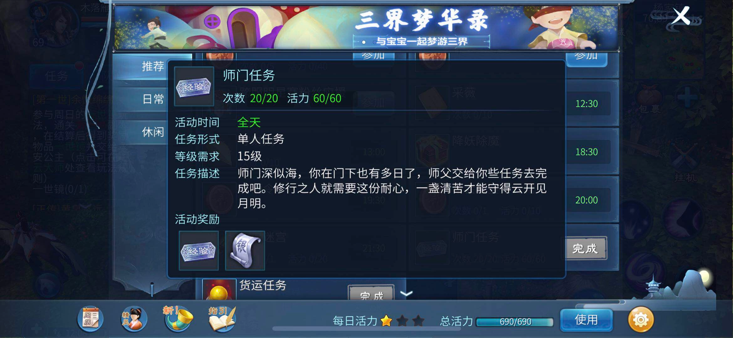 二、通过一条龙任务与师门任务获取经验