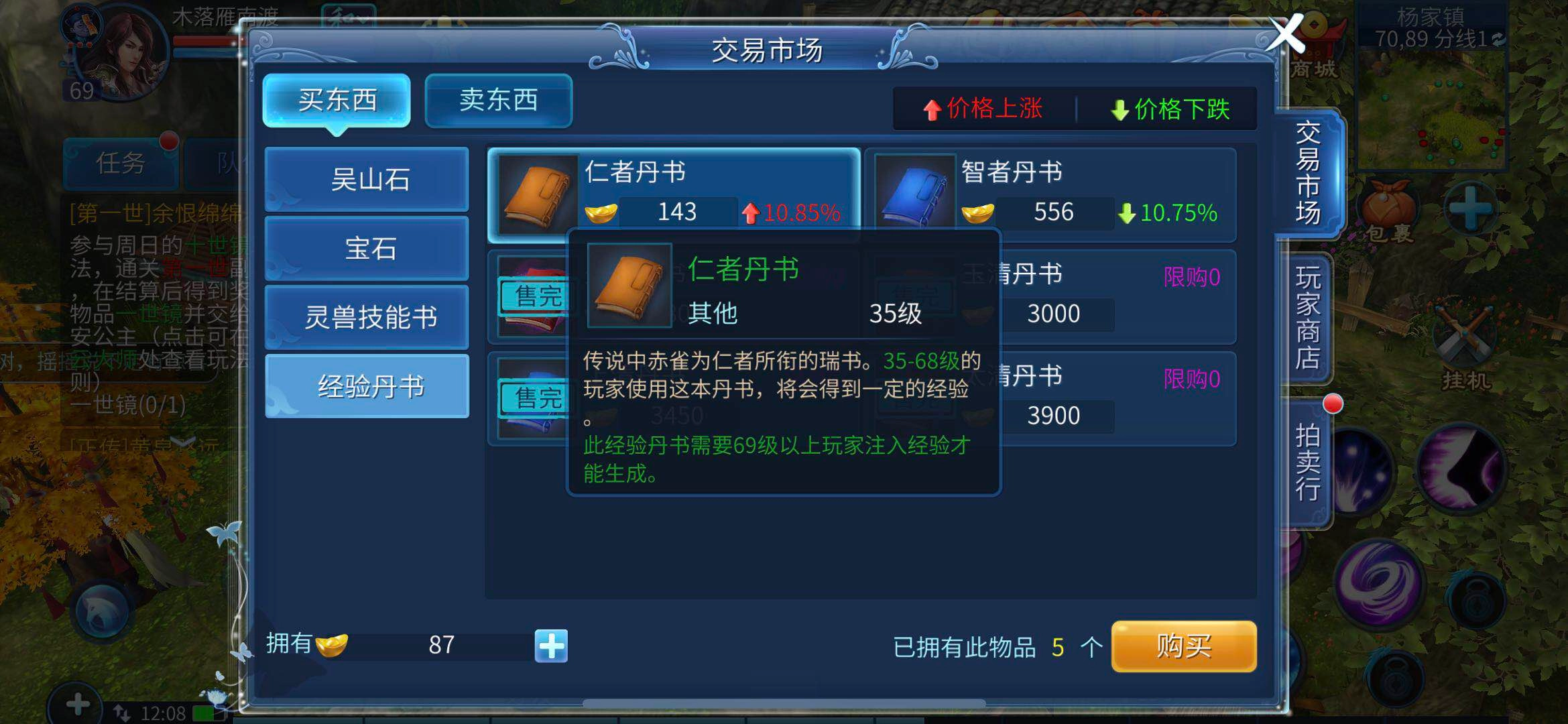 玩家还能选择购买经验。在六十九级之前(不含六十九级),可以在易市里购买并使用一种叫仁者丹书的道具。这种道具是由六十九级及以上的玩家注入经验后售卖的,使用后能直接获得大量经验,差不多有一百三十多万,足够快速升级。而且玩家一天最多只能用四本,通过这种方式一天能拿到五百多万经验。