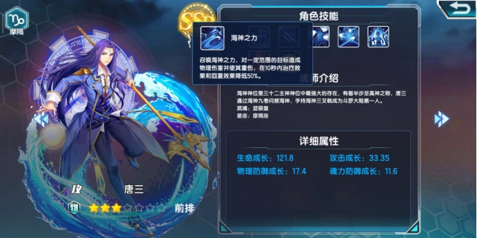 我们先来了解一下第一个角色SSR唐三,他属于强攻系魂师,在队伍中站前排位置。唐三的首个技能是海神之力,能够对范围内的目标造成物理伤害,同时让目标陷入重伤状态,处于该状态的敌人在随后的十秒里,治疗与回复效果都会降低一半。这个重伤效果的作用还是挺显著的。