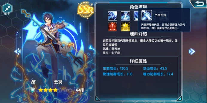 最后一个是云冥,云冥是一个强攻系中排,但是却又有控制,有防御,一技能有一定控制,四技能还有护盾反弹伤害,最后一个技能是个加持伤害增益buff。