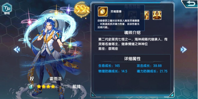 下一个登场的是SSR级别的霍雨浩,他属于控制系魂师,同时拥有出色的高爆发能力。他的第二魂技“灵魂震慑”是一个范围性的AOE技能,能够造成多次伤害,而且这些伤害是无法被闪避的。第四魂技“灵魂冲击”同样具备高爆发特性,但这个技能更突出的优势在于对非英雄单位的针对性效果。