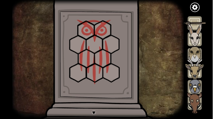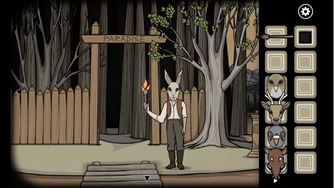 接下来玩家要进行五个小解谜:点击第一个兔子雕像,这里只需要左右轮流点击中间的白色按钮即可,完成几次之后即可获得一个兔子面具。