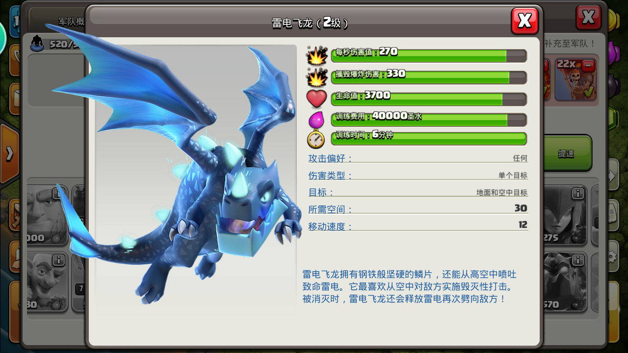 这是一种相当强悍的兵种,具备极为可观的伤害输出能力。借助实验室的升级功能,能够将雷电飞龙提升至二级,此时它的生命值可达三千七百点,称得上是攻击强劲且生存能力出色的存在。